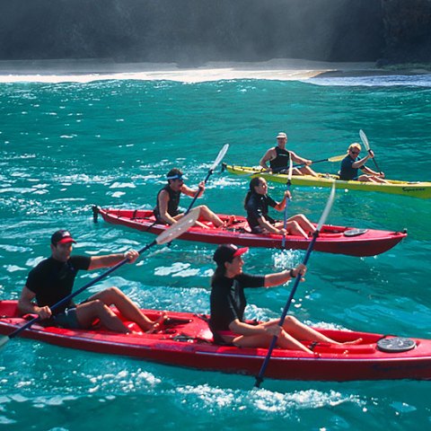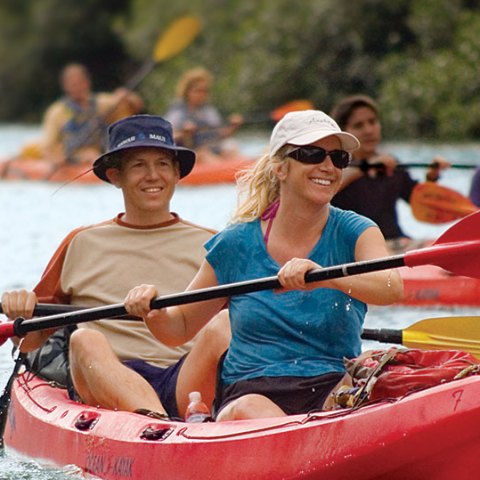 They wanted to do it right, and began to pursue acquiring governmental permits to operate guided tours on Kauai, and in 1988, received the first permit in the State of Hawaii to run guided sea kayak tours from State facilities. They opened Outfitters Kauai, in Poipu, in the fall of that year, and in the ensuing years have had a great time developing fun new things to do and making people’s vacation dreams come true. Outfitters Kauai was also an initial permitted operator of guided kayak tours of Wailua River State Park and Na Pali Coast, which is a 15-mile wilderness coastline on Kauai’s North Shore. Waimea Canyon Bicycle Downhill tours were started up in ’94. In 1999 Outfitters negotiated land and water use agreements to enable an innovative guided kayaking tour on Hule’ia River that allows participants to paddle downwind through a National Wildlife Refuge location that was a backdrop to the film Raiders of the Lost Ark. The tour group hikes to waterfalls located at the famous Kipu Ranch, and returns to their private dock by an exotic doubled- hulled motorized Hawaiian canoe.