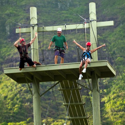 Rick’s past work as a pole climbing lineman and his cable handling skills came in handy when, in 2001, he was inspired by a National Geographic article about canopy tours in Costa Rica, and began to pursue and construct Kauai’s first zipline alongside a Kipu Ranch site used in the filming of the movie Jurassic Park. It was opened for business in 2003. Since then, Outfitters has continued to innovate, bringing together more ziplines, waterfalls, canopy walkways, treehouses, rappelling, suspension bridges, and even waterzips for the enjoyment of their guests. After over 25 years, Outfitters Kauai is still doing new things all the time, and still making people’s vacation dreams come true.