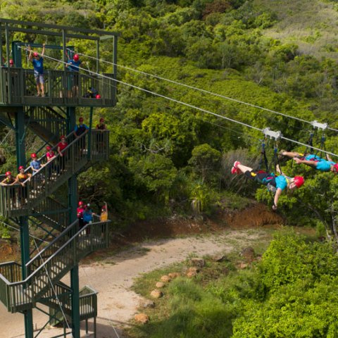 On May 1, 2017, we launched our newest venue… the 3/4 mile long FlyLine Kauai Zipline, and the Kipu Ranch Visitor Welcome Center and Ticket Office. The result is improved and reconfigured Zipline Event packages, and a new, convenient check-in location. Even more fun, even better value! Each zipline tour is unique, as our lines vary by size, skill-level, and terrain. Fly with us over lush valleys, tumbling waterfalls and forest canopies — landscapes made famous by movies like Jurassic Park, Pirates of the Caribbean, and Indiana Jones Raiders of the Lost Ark.