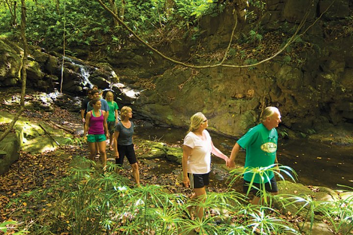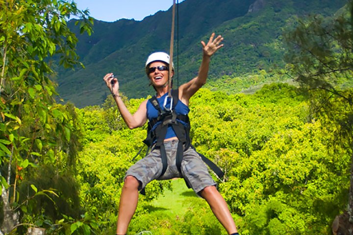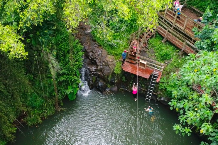 Start your adventure with an easy two-mile paddle on the scenic Hule’ia River while being serenaded by tropical birds. A short hike takes you to small waterfalls where those who want to swim can swing Tarzan-style into a fresh-water pool. After water play, take a ride across Kipu Ranch (where scenes were filmed for The Descendants, Jurassic Park and Raiders of the Lost Ark). Your expert guides will help you get suited up in zipline harnesses for major fun zipline rides. Waterzip, a great picnic lunch, a half mile hike back to the river, and a kick-back cruise on our motorized canoe round out this fabulous adventure in some of the most beautiful backdrops to be found anywhere.