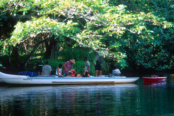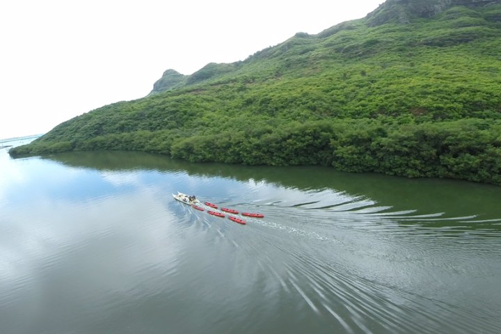 Rather than paddling back into the wind, finish your kayaking adventure in style with a relaxing ride back on a motorized canoe through this treasured area, which is listed on the National Register of Historic places. This Hidden Valley falls kayak tour is the only kayak tour in all of Hawaii with return by motorized canoe. This adventure is easygoing fun and excitement for everyone! Paddle downwind, take a stroll through the jungle, kick back and cruise to the dock with your USCG Captain at the helm.